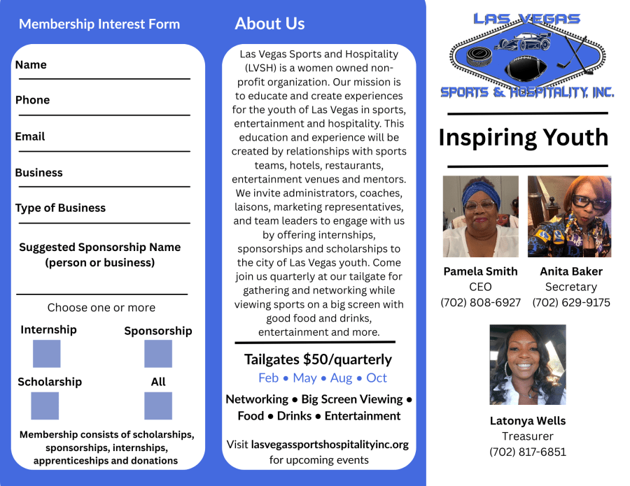 Las Vegas Sports and Hospitality (LVSH) is a women owned non-profit organization. Our mission is to educate and create experiences for the youth of Las Vegas in sports, entertainment and hospitality. This education and experience will be created by relationships with sports teams, hotels and restaurants and entertainment venues. We invite administrators, coaches, liaisons, marketing representatives, and team leaders to engage with us by offering internships, sponsorships and scholarships to the city of Las Vegas youth. LVSH provides youth interested in mentorship, fully equipped meeting and activity venue, transportation, meals & snacks, administrative services such as meeting and material set up and training assistance. For additional information call (702) 808-6927.
